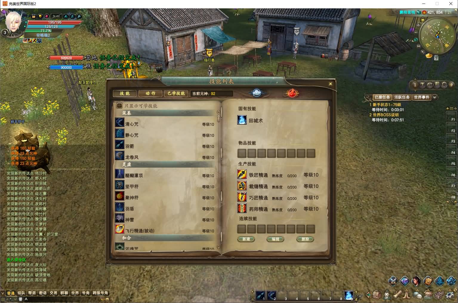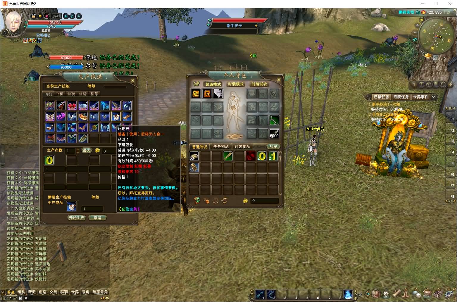 新手出生: 上线1级,出生地鹏程客栈,仓库背包全开,生产技能10级。地图全开,包裹全扩,赠送一键拾取。